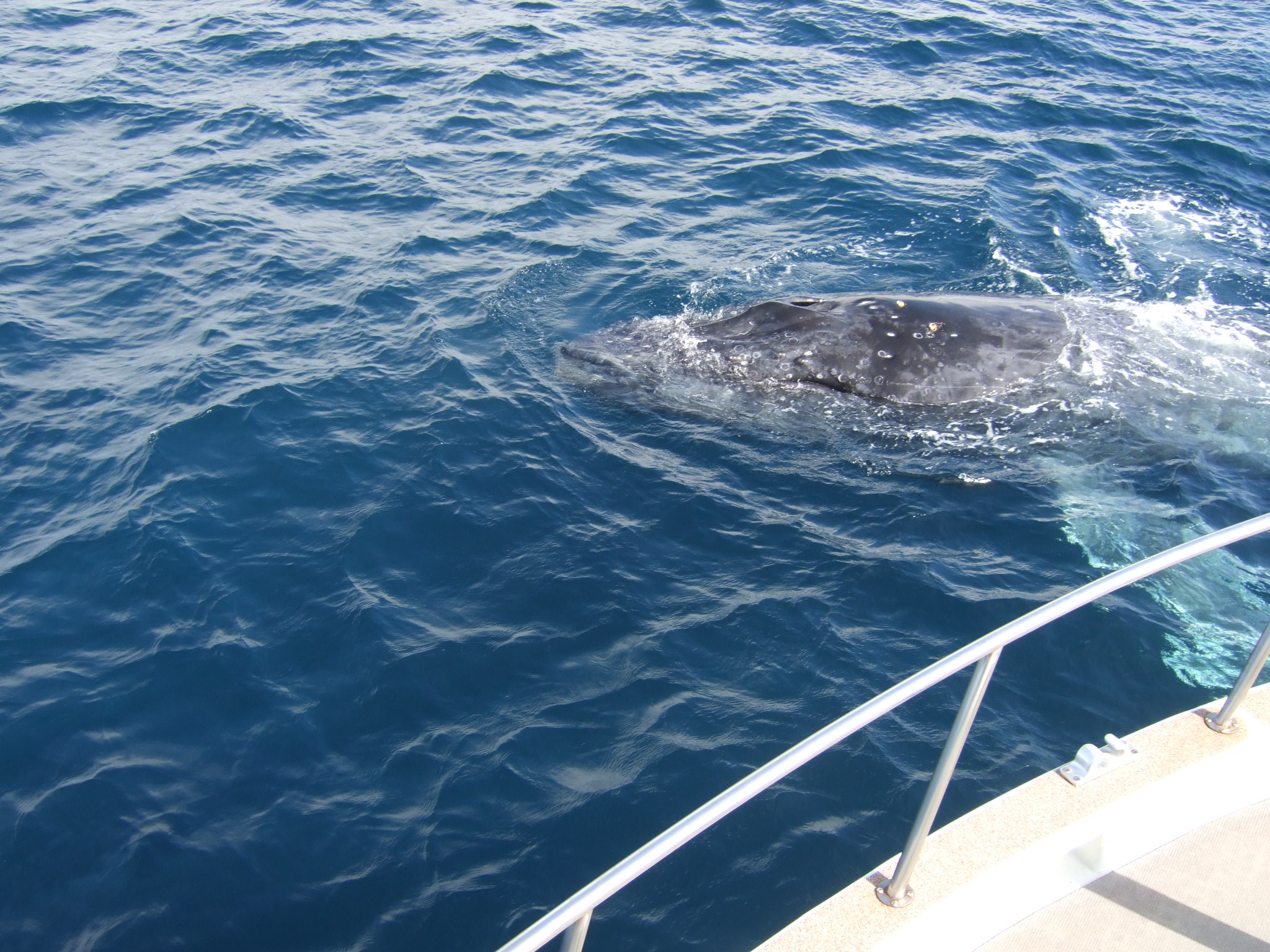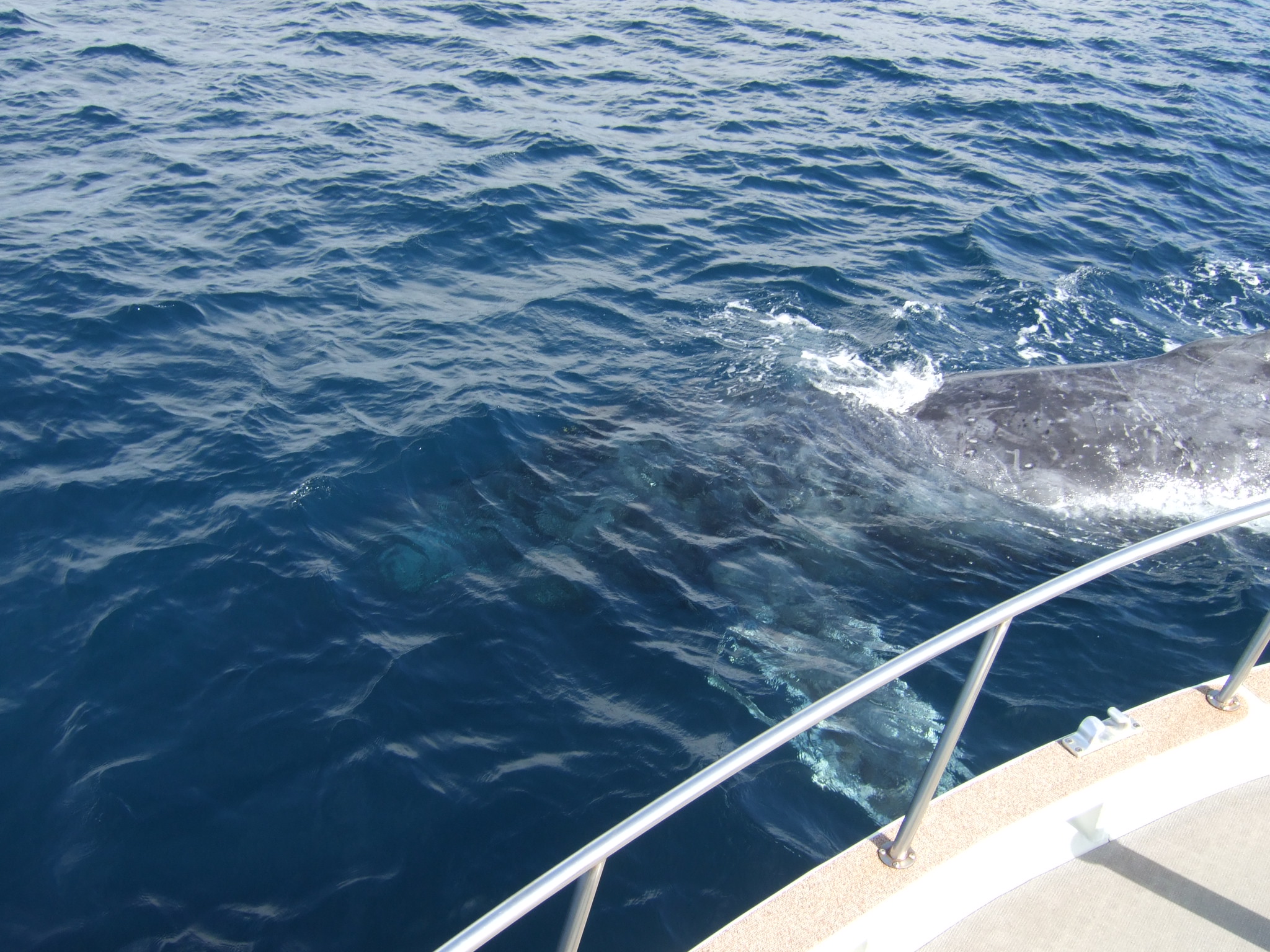 私達の乗っていた船の真横に現れて、船をくぐって顔を出しました!船の大きさが15メートルくらいで、クジラさん(どうやら若い男の子だそうです)はおよそ10メートル。スタッフの方々も我を忘れて大騒ぎするくらいのすごかったそうです。