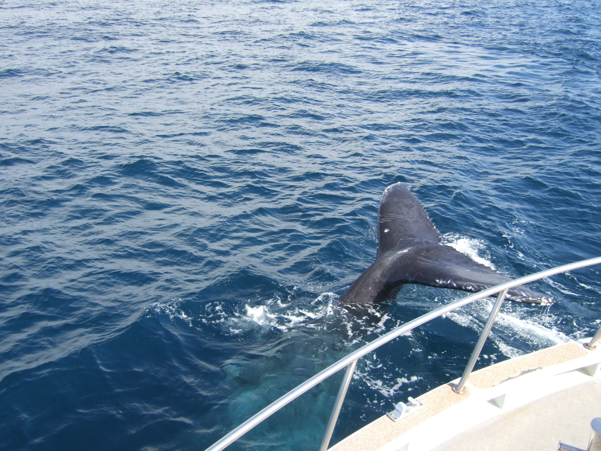 最初は遠くにクジラが潮を吹いたり、背びれを出してもぐったりするのが見えて大興奮!でしたが、そのクジラがなんと。。