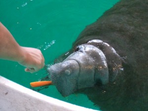 マナティさんはちょうどお昼ごはんで、飼育員さんからにんじんをもらってました。
