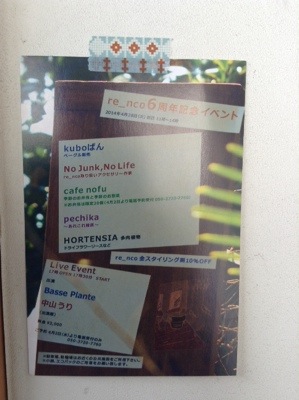 2014 年 4 月 2 日 by re_nco お陰様でre_ncoも4月26日で6周年を迎えます。 皆様に支えられて6周年を迎えられる事に、本当に感謝します。 ありがとうございます! 今年もイベントを開催する事になりましたので、お誘い合わせの上ぜひぜひ遊びにいらしてくださいね。 尚、スタイリング剤を購入予定のお客様は、事前にお取り置きも出来ますので、ご連絡を頂けたらと思います。 よろしくお願いします。 ※駐輪場、駐車場はご用意してませんので、お近くの公共施設をご利用ください。 ※小銭、エコバックのご用意をお願いいたします。