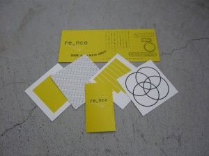 re_ncoのロゴマークやDMの総合的なデザインを担当して頂いた岡室さんが、JAGDAの新人賞に選ばれ今回展示会をする事になりました。岡室さんは忙しい中、知人からの紹介でre_ncoオープンプロジェクト(笑)に参加して頂き、re_ncoという空間への想いを十分に理解してそれを形にしてくれたのです。