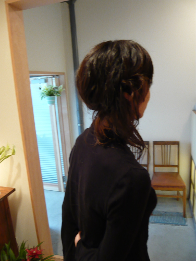 先日re_ncoのデザインをして頂いた岡室さんの展示会に行ってきました。オープニングパーティということで、山賀さんにアシンメトリーのデザインのアップスタイルをしてもらっていざ銀座へ。